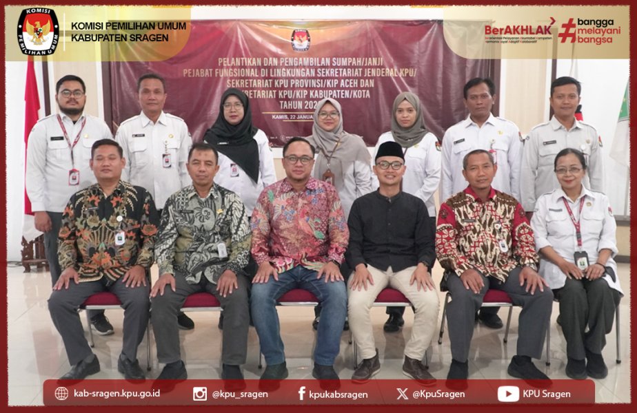 Sragen, kab-sragen.kpu.go.id - Sekretaris Jenderal KPU RI, Bernad Dermawan Sutrisno, melantik dan mengambil sumpah jabatan Pejabat Fungsional Tingkat Pertama Penata Kelola Pemilihan Umum di lingkungan Sekretariat Jenderal KPU RI, KPU Provinsi/KIP Aceh, serta Sekretariat KPU Kabupaten/Kota Tahun 2026, pada Kamis (22/01/2026). Pelantikan digelar secara hybrid, yakni luring dan daring, berdasarkan Keputusan Sekretaris Jenderal KPU RI Nomor 125, 126, 127, dan 128 Tahun 2026. Pelantikan dipusatkan di Kantor KPU RI yang hadir secara langsung, sementara KPU Provinsi dan KPU Kabupaten/Kota mengikuti prosesi secara daring melalui zoom meeting dari satuan kerja masing-masing di seluruh Indonesia. Dalam sambutannya, Sekretaris Jenderal KPU RI menegaskan bahwa jabatan di lingkungan KPU tidak hanya terbatas pada jabatan struktural, tetapi juga mencakup jabatan fungsional yang memiliki peran dan tanggung jawab strategis. Karena itu, para pejabat fungsional yang dilantik diharapkan terus meningkatkan etos kerja, integritas, serta dedikasi dalam menjalankan tugas. Bernad juga menekankan bahwa pelantikan ini tidak mengubah lokus penugasan para pejabat fungsional. Namun demikian, ia berharap adanya peningkatan kualitas kinerja dalam pelaksanaan tugas sehari-hari. Ketua KPU RI, Muhammad Afifuddin, turut memberikan sambutan. Ia menyampaikan bahwa pelantikan pejabat fungsional ini diharapkan menjadi momentum untuk menumbuhkan semangat baru dalam bekerja, sekaligus meningkatkan loyalitas dan kenyamanan pegawai dalam menjalankan tugas di lingkungan KPU. “KPU senantiasa memperhatikan pengembangan karier dan jabatan setiap pegawai. Dengan demikian, diharapkan dapat meningkatkan karier dan kesejahteraan seluruh pegawai KPU. Pejabat fungsional yang baru dilantik agar tetap semangat dan bangga menjadi bagian dari KPU RI,” ujar Afifuddin. Di KPU Kabupaten Sragen, pelantikan disaksikan oleh Ketua, Anggota, Sekretaris, para Kasubbag, serta jajaran Sekretariat KPU Kabupaten Sragen. Sebanyak tujuh pejabat fungsional di lingkungan KPU Kabupaten Sragen turut dilantik, yaitu Winanti Yuliastuti, S.E., Lucman Setyawan Imam Prasetyo, S.E., Suwarno, S.E., Agung Sapto Adi, S.P., Faisal Adami, S.H., Khusnul Azizatunnishak, S.E., dan Indriana Felayani Putri, S.IP. Pelantikan ini menjadi langkah penting dalam memperkuat kapasitas kelembagaan KPU melalui optimalisasi peran pejabat fungsional di seluruh tingkatan. [A] ....