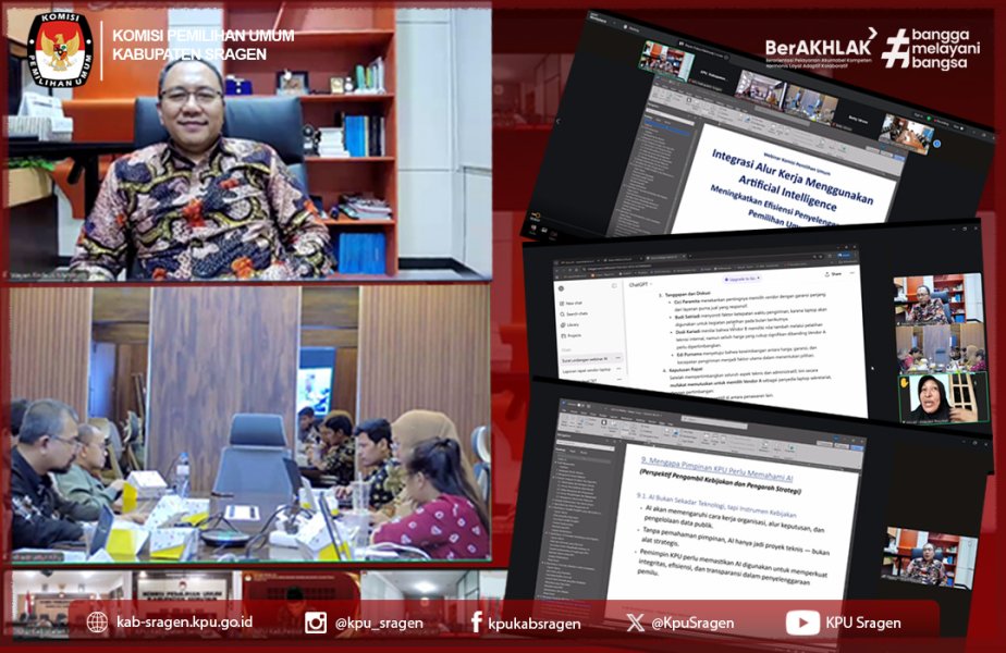 Sragen, kab-sragen.kpu.go.id - KPU Kabupaten Sragen mengikuti webinar “Integrasi Alur Kerja Menggunakan Kecerdasan Buatan (Artificial Intelligence/AI)” yang diselenggarakan oleh KPU Republik Indonesia secara daring pada Jumat (24/10/2025). Webinar ini merupakan bagian dari seri pembelajaran digital yang diselenggarakan oleh KPU RI, dan akan dilanjutkan dengan sesi lanjutan mengenai penerapan tools AI untuk integrasi alur kerja di lingkungan KPU. Kegiatan dibuka secara resmi oleh Anggota KPU RI, Ketua Divisi Data dan Informasi, Betty Epsilon Idroos, yang menyampaikan bahwa perkembangan kecerdasan buatan (AI) sangat pesat dan penting untuk dipahami serta dimanfaatkan oleh jajaran KPU di seluruh Indonesia. “AI merupakan salah satu metode pengumpulan big data dan dimungkinkan untuk mengolah data tersebut dengan berbagai algoritma data. Teknologi ini dapat membantu mempercepat dan mempermudah pekerjaan kita, namun tetap manusia yang memutuskan dalam pengambilan kebijakan, AI hanya alat untuk memudahkan pekerjaan kita saja,” ujar Betty. Selain itu, ia juga menekankan bahwa pemanfaatan AI di lingkungan KPU diharapkan dapat meningkatkan efisiensi, efektivitas, dan akurasi dalam pengelolaan data kepemiluan, tanpa mengesampingkan prinsip transparansi dan akuntabilitas. Webinar menghadirkan narasumber Wayan Firdaus Mahmudy, dari Universitas Brawijaya, Malang. Dalam paparannya, Wayan menjelaskan konsep dasar kecerdasan buatan, jenis-jenis penerapannya, serta peluang integrasi AI dalam mendukung tugas-tugas kepemiluan. Selanjutnya disampaikan pentingnya seorang pemimpin untuk memahami Artificial Intelligence (AI) bukan hanya sebagai alat teknis, tetapi sebagai instrumen strategis dalam pengambilan kebijakan. Ia menekankan bahwa pemanfaatan AI dapat meningkatkan efisiensi, akurasi, dan transparansi dalam proses administrasi, termasuk dalam konteks pemutakhiran data pemilih dan deteksi anomali data. Narasumber melanjutkan bahwa penggunaan AI harus disertai dengan data yang valid dan seragam agar hasilnya akurat. Selain itu, ia mengungkapkan bahwa munculnya resistensi pegawai terhadap teknologi baru merupakan hal yang wajar, seperti halnya munculnya layanan transportasi daring di masa lalu. Diskusi juga menyinggung potensi AI dalam mendeteksi indikasi money politics pada pelaksanaan pemilu/pemilihan, yang dinilai masih memerlukan kemampuan manusia sebagai dasar pembelajarannya. Melalui contoh penerapan generative AI seperti ChatGPT dan Copilot, peserta diajak memahami bagaimana teknologi dapat mempercepat pekerjaan administratif, menyusun dokumen, hingga mendukung analisis data secara cerdas. Rapat ini menjadi langkah penting dalam mendorong transformasi digital lembaga publik yang bertanggung jawab, aman, dan adaptif terhadap perkembangan teknologi, “AI jadi alat bantu, bukan pengambil keputusan, bahwa peran manusia tetap sentral dalam pengambilan keputusan” tegas Wayan. Kemandirian teknologi menjadi kunci bagi KPU untuk terus mendorong pengembangan AI Nasional sebagai alat bantu peneyelengagraan Pemilu dan Pemilihan selanjutnya. Melalui webinar ini, KPU Kabupaten Sragen berkomitmen untuk terus beradaptasi dengan perkembangan teknologi informasi serta mendorong pemanfaatan kecerdasan buatan dalam mendukung penyelenggaraan Pemilu/Pemilihan yang lebih modern, transparan, dan efisien. [HA]