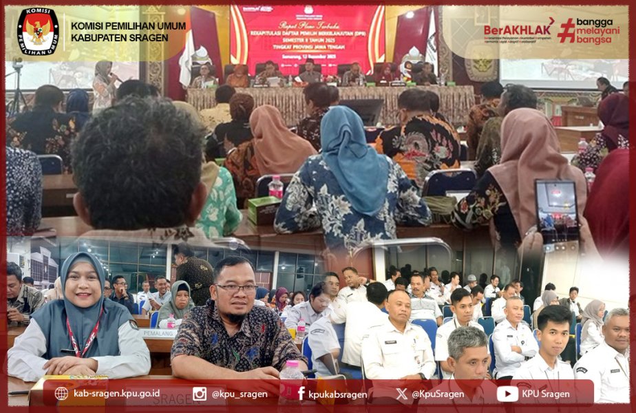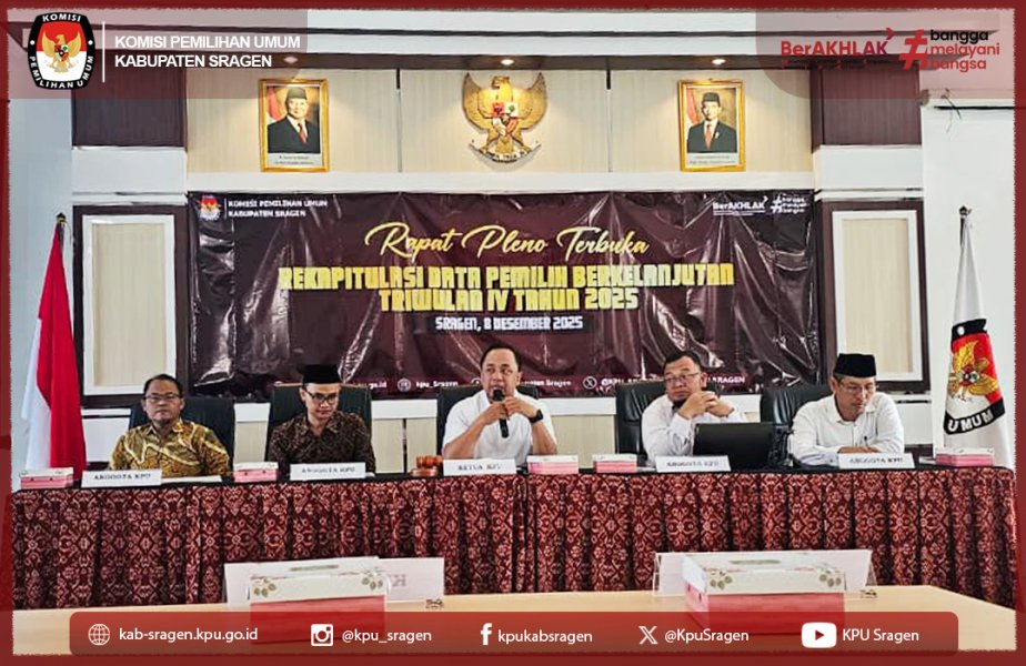 Sragen, kab-sragen.kpu.go.id - KPU Kabupaten Sragen melaksanakan Rapat Pleno Terbuka Rekapitulasi Data Pemilih Berkelanjutan (PDPB) Triwulan IV tingkat Kabupaten Sragen pada Senin (08/12/2025), bertempat di aula kantor KPU Sragen. Rapat pleno secara resmi dibuka oleh Ketua KPU Sragen, Prihantoro PN, yang sekaligus memimpin jalannya rapat dengan dihadiri oleh seluruh anggota KPU Kabupaten Sragen, memenuhi jumlah kuorum yang ditetapkan. Rapat pleno juga dihadiri antara lain perwakilan dari Polres Sragen, Kodim 0725/Sragen, Kementerian Agama Sragen, Asisten 1 Setda Sragen, Dinas Kependudukan dan Pencatatan Sipil, Badan Kesatuan Bangsa dan Politik, Lapas Kelas IIA Sragen, serta Bawaslu Kabupaten Sragen. Dalam rapat tersebut, menetapkan bahwa jumlah Data Pemilih Berkelanjutan Triwulan IV tingkat Kabupaten Sragen adalah sebagai berikut: Pemilih laki-laki: 387.873 pemilih Pemilih perempuan: 399.738 pemilih Total keseluruhan: 787.611 pemilih Ketua Divisi Perencanaan, Data, dan Informasi KPU Kabupaten Sragen, MH. Isnaeni, membacakan hasil rekapitulasi Data Pemilih Berkelanjutan Triwulan IV Tahun 2025 per kecamatan dan tingkat kabupaten Sragen, yang kemudian hasilnya dituangkan dalam Berita Acara Rapat Pleno KPU Sragen Nomor 75/TIK.04-BA/3314/3/2025 tentang Rekapitulasi Daftar Pemilih Berkelanjutan Triwulan IV Tahun 2025, dan ditetapkan dengan Keputusan KPU Sragen Nomor 25 Tahun 2025 tentang Penetapan Rekapitulasi Pemutakhiran Data Pemilih Berkelanjutan Kabupaten Sragen Provinsi Jawa Tengah Triwulan Keempat Tahun 2025. Jika dibandingkan dengan hasil rekapitulasi Data Pemilih Berkelanjutan Triwulan III Tahun 2025, maka terdapat kenaikan jumlah pemilih sejumlah 7.277 pemilih. Faktor penambahan atau pengurangan jumlah pemilih disebabkan antara lain adanya pemilih yang meninggal dunia, pindah domisili, perubahan status TNI/Polri, serta telah mencapai usia 17 tahun. Berikut dibawah ini adalah rincian hasil Rekapitulasi PDPB Triwulan IV Tahun 2025 pada Kabupaten Sragen: No. Nama Kecamatan Jumlah Desa/ Kel Jumlah Pemilih L P L+P 1 KALIJAMBE 14 21.279 21.241 42.520 2 PLUPUH 16 20.349 20.786 41.135 3 MASARAN 13 30.702 31.337 62.039 4 KEDAWUNG 10 26.253 26.926 53.179 5 SAMBIREJO 9 16.311 16.669 32.980 6 GONDANG 9 18.608 19.229 37.837 7 SAMBUNGMACAN 9 19.421 19.995 39.416 8 NGRAMPAL 8 16.701 17.509 34.210 9 KARANGMALANG 10 27.795 29.383 57.178 10 SRAGEN 8 27.151 28.965 56.116 11 SIDOHARJO 12 22.883 23.732 46.615 12 TANON 16 23.409 23.987 47.396 13 GEMOLONG 14 20.350 21.126 41.476 14 MIRI 10 14.677 14.988 29.665 15 SUMBERLAWANG 11 19.720 20.424 40.144 16 MONDOKAN 9 15.879 15.936 31.815 17 SUKODONO 9 13.424 13.940 27.364 18 GESI 7 9.159 9.505 18.664 19 TANGEN 7 11.818 11.858 23.676 20 JENAR 7 11.984 12.202 24.186 TOTAL 208 387.873 399.738 787.611 ► Rekapitulasi PDPB per Triwulan Tahun 2025