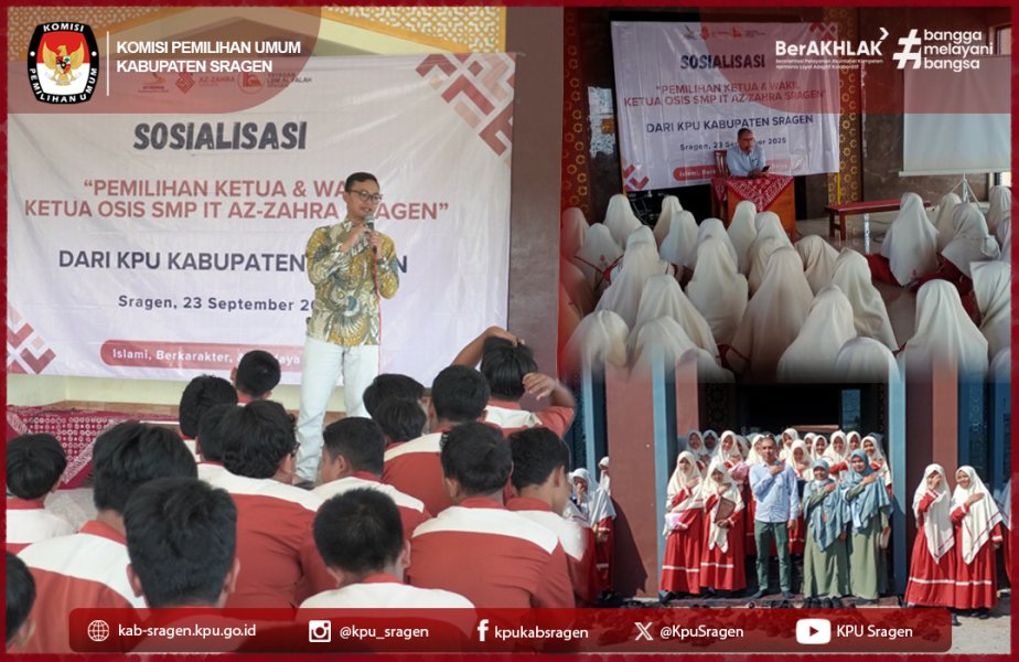 Sragen, kab-sragen.kpu.go.id – Komisi Pemilihan Umum (KPU) Kabupaten Sragen kembali hadir memberikan sosialisasi kepemiluan dalam kegiatan Pemilihan Ketua OSIS (Pilketos) di SMP IT Az Zahra Sragen, Selasa (23/09/2025). Pendampingan ini merupakan bagian dari komitmen KPU Sragen dalam membangun pemahaman politik sejak usia dini, sekaligus memperkuat literasi demokrasi di kalangan pelajar.