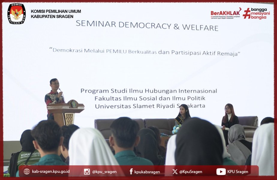 Surakarta, kab-sragen.kpu.go.id – Demokrasi bukan hanya soal memilih, tetapi juga menjamin kesejahteraan dan masa depan bangsa. Untuk memperkuat pemahaman mengenai pentingnya pemilu berkualitas dan partisipasi aktif kaum muda, Himpunan Mahasiswa Hubungan Internasional (HIMAHI) UNISRI Kabinet Akasacita menyelenggarakan kegiatan Praktisi Mengajar – Seminar Democracy & Welfare bertema “Demokrasi melalui Pemilu Berkualitas dan Partisipasi Aktif Remaja.”