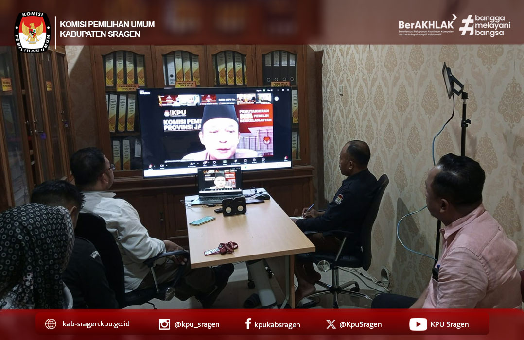 Sragen, kab-sragen.kpu.go.id – Ketua KPU Sragen, Prihantoro, Divisi Perencanaan, Data dan Informasi, M.H. Isnaeni, besama Kepala Sub Bagian Perencanaan, Data dan Informasi, Herlina Astri, dan staf pelaksana mengikuti Rapat Koordinasi Pemutakhiran Daftar Pemilih Berkelanjutan yang dilaksanakan pada Rabu sore (28/05/2025) melalui zoom meeting di ruang JDIH KPU Kabupaten Sragen.