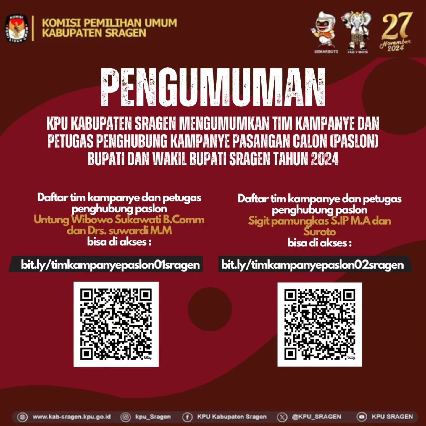 KPU Kabupaten Sragen mengumumkan daftar tim kampanye dan petugas penghubung yang telah terdaftar secara resmi untuk pasangan calon (paslon) Bupati dan Wakil Bupati Sragen Tahun 2024