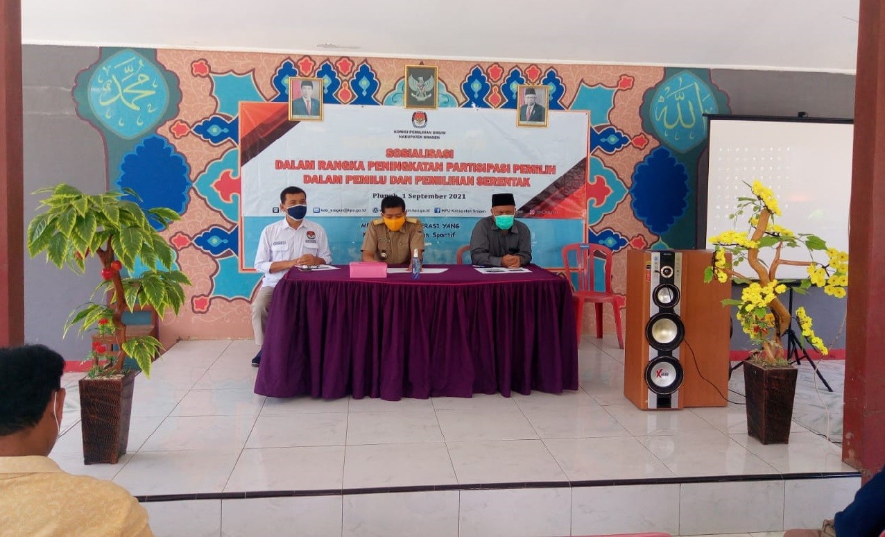 Sragen- Mendasar pada Tugas KPU Kabupaten/Kota Pasal 18 Undang-Undang Nomor 7 Tahun 2017 tentang Pemilihan Umum, Komisi Pemilihan Umum Kabupaten Sragen pada hari Rabu tanggal 1 September 2021 melakukan Sosialisasi Pendidikan Pemilih di Desa Ngrombo Kecamatan Plupuh yang dengan angka partisipasi 64, 86% (tergolong partisipasi rendah). Sosialisasi yang di laksanakan dengan penerapan protokol kesehatan penanggulangan Covid 19 ini dihadiri oleh Komisioner Divisi Sosdiklih Parmas dan SDM ( Bp. Nanang Tetuka) serta Komisioner Divisi Hukum dan Pengawasan (Bp. Suwarsono) dengan peserta dari Tokoh Masyarakat, mantan PPS dan mantan KPPS serta warga desa setempat, diharapkan dapat menaikkan partisipasi pemilih pada Pemilu dan Pemilihan Serentak yang akan datang.