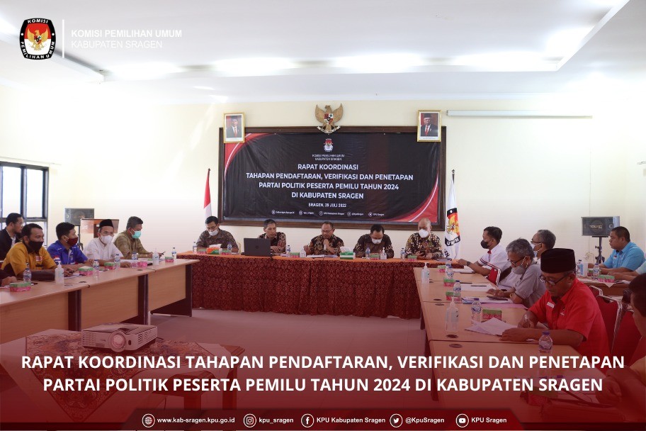 KPU Kabupaten Sragen telah menyampaikan semua undangan rapat koordinasi ke perwakilan atau pihak yang bersangkutan dari partai politik. Dari 20 partai politik yang diundang, hanya 18 partai politik yang mengikuti rapat koordinasi. Rapat koordinasi tersebut juga dihadiri oleh Ketua BAWASLU Kabupaten Sragen Bp. Dwi Budhi Prasetya, S.Fil.I. dan Perwakilan dari KESBANGPOL Kabupaten Sragen Bp. Kumaedi Thohir, S.IP.