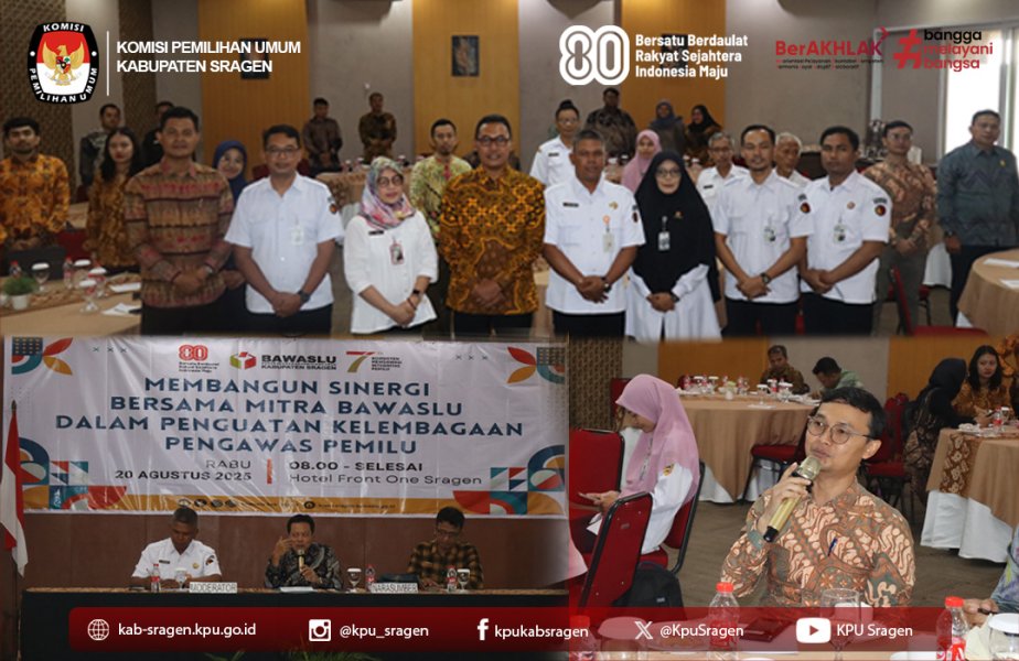 Sragen, kab-sragen.kpu.go.id - Anggota KPU Kabupaten Sragen, Ketua Divisi Sosisdiklih Parmas dan SDM, Irwan Sehabudin, hadir sebagai peserta memenuhi undangan dari Bawaslu Kabupaten Sragen yang menyelenggarakan kegiatan Membangun Sinergi Bersama Mitra Bawaslu dalam Penguatan Kelembagaan Pengawas Pemilu, Rabu (20/08/2025) di Hotel Front One Sragen. Kegiatan yang diikutii oleh akademisi, pemantau pemilu, dan mitra strategis Bawaslu, serta menghadirkan narasumber antara lain Anggota DPR RI Komisi II, Muhammad Toha, Anggota Bawaslu Jawa Tengah, Nur Kholiq, serta Tenaga Ahli Bawaslu RI periode 2017-2022, Maskurudin Hafidz tersebut bertujuan untuk membangun institusi yang profesional serta menguatkan peran Bawaslu dalam menciptakan pemilu yang demokratis. Dari kegiatan tersebut, Bawaslu Sragen mengharapkan adanya masukan dan saran untuk penyelenggaraan pemilu di waktu mendatang yang lebih baik. Kegiatan berjalan dinamis dan banyak masukan yang disampaikan oleh peserta kegiatan, salah satunya dari KPU Sragen yang diwakili oleh Irwan Sehabudin. Ia menyampaikan masukan agar KPU dan Bawaslu dapat meningkatkan kaloborasi dan sinergitas, serta tetap menjaga integritas sebagai penyelenggara pemilu, karena persoalan yang dihadapi cukup banyak yang menguji integritas. [IS/Ag]