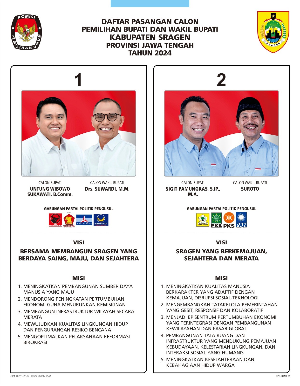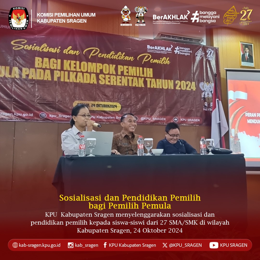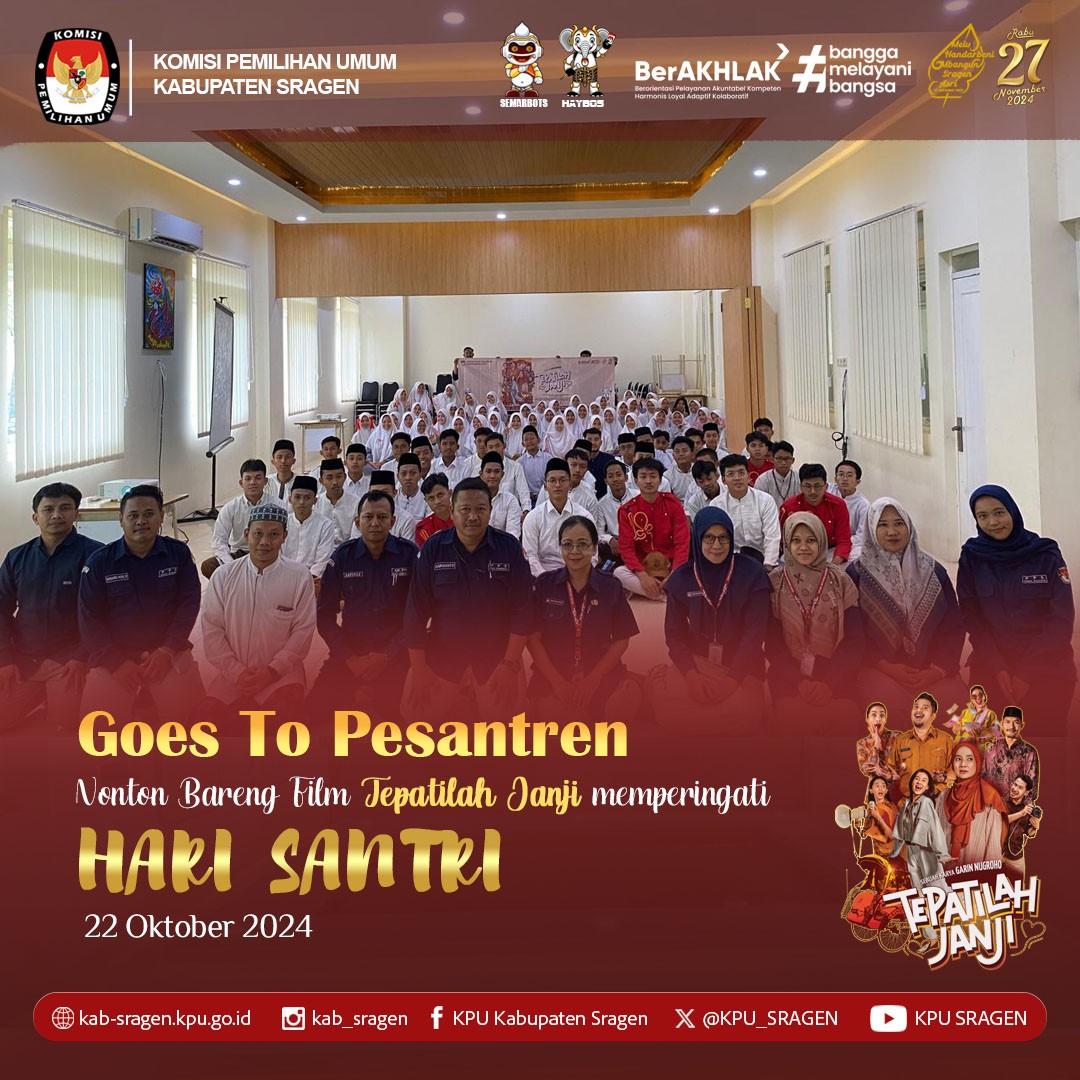 Sragen, kab-sragen.kpu.go.id - KPU Kabupaten Sragen beserta jajaran Badan Adhoc Panitia Pemilihan Kecamatan (PPK) menggelar kegiatan sosialisasi bertajuk goes to pesantren dengan acara nonton bareng film “Tepatilah Janji”, sebuah film karya sutradara Garin Nugroho. Kegiatan tersebut diselenggarakan sekaligus juga dalam rangka memperingati Hari Santri yang jatuh pada 22 Oktober 2024. Sosialisasi nobar film “Tepatilah Janji” diselenggarakan di 10 tempat pondok pesantren maupun Madrasah Aliyah Negeri di wilayah Kabupaten Sragen, antara lain Ponpes Baitul Qur’an-Sambirejo, Ponpes Walisongo-Karangmalang, Manba’uth Thoyyibah-Mondokan, Ponpes Ma’i Al Makruf-Sumberlawang, Mahad Aisiyah-Gemolong, MA Dimsa-Sambungmacan, Alhikmah-Tanon, Man 1 Sragen, MAN 2 Sragen-Plupuh, dan MAN 3 Sragen-Kalijambe. Kegiatan diikuti oleh santriwan dan santriwati, maupun siswa-siswa yang berjumlah kurang lebih seratusan siswa di masing-masing tempat. Tujuan dari kegiatan ini adalah untuk memberikan pendidikan dan meningkatkan partisipasi pemilih pemula dalam keikutsertaannya di Pemilihan Gubernur dan Wakil Gubernur Jawa Tengah, dan Bupati dan Wakil Bupati Sragen Tahun 2024. Melalui kegiatan sosialisasi dengan kemasan nobar film bergenre komedi yang mengangkat isu-isu politik, antara lain mengenai isu money politics maupun dinasti politik, diharapkan dapat menarik perhatian dan meningkatkan kesadaran politik kaum milenial dan Gen Z dengan berpartisipasi sebagai pemilih pada hari pemungutan suara, Rabu, 27 November 2024 mendatang. [A]