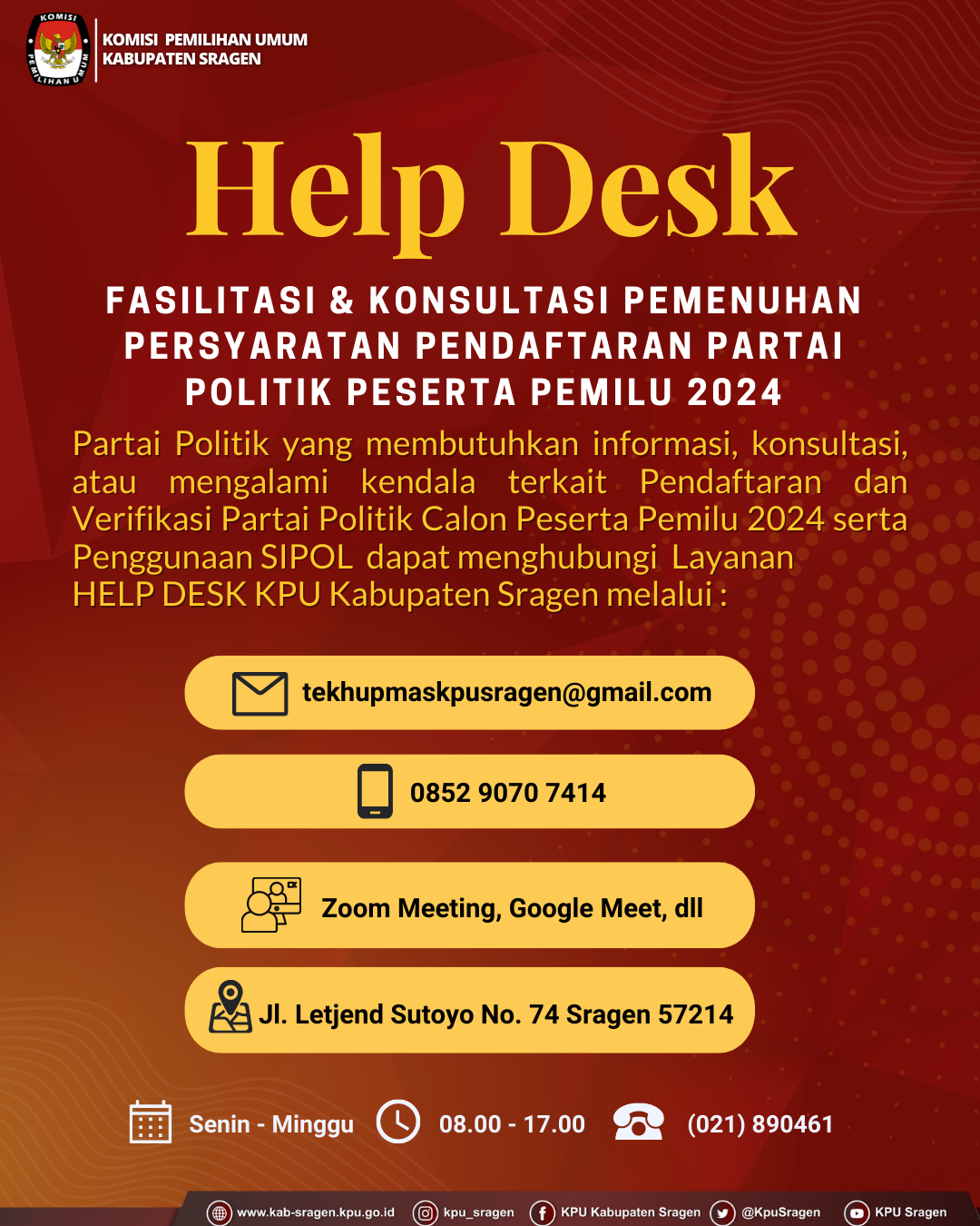 #TemanPemilih KPU Kabupaten Sragen pada 1 Agustus 2022 kemarin telah membuka layanan Help Desk terkait Fasilitasi dan Konsultasi Pemenuhan Persyaratan Pendaftaran Partai Politik Peserta Pemilu 2024. Bagi Partai Politik di Kabupaten Sragen yang membutuhkan informasi lebih lanjut, konsultasi ataupun mengalami kendala dapat menghubungi layanan help desk yang tertera pada postingan ini, yuk mari kita simak!