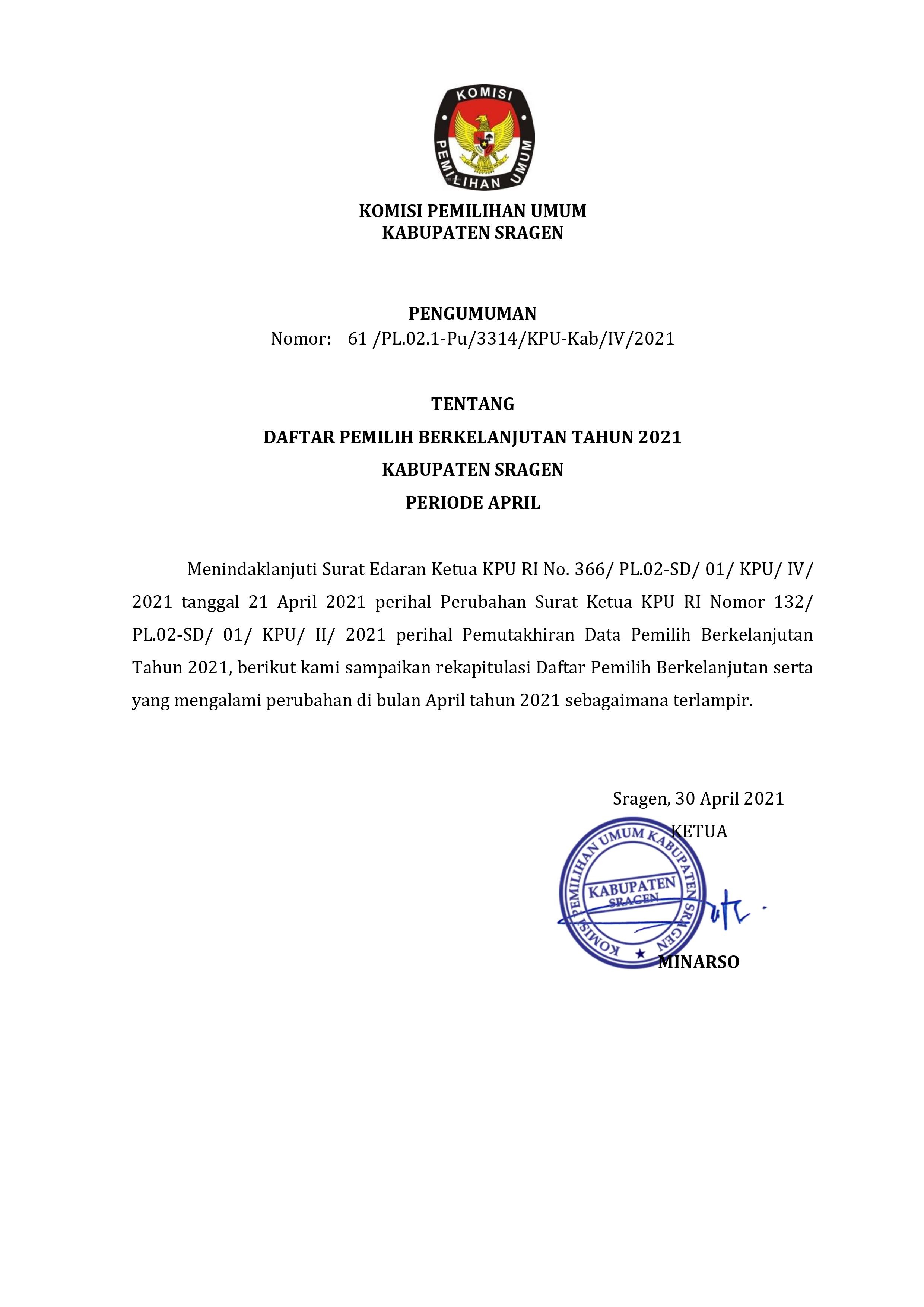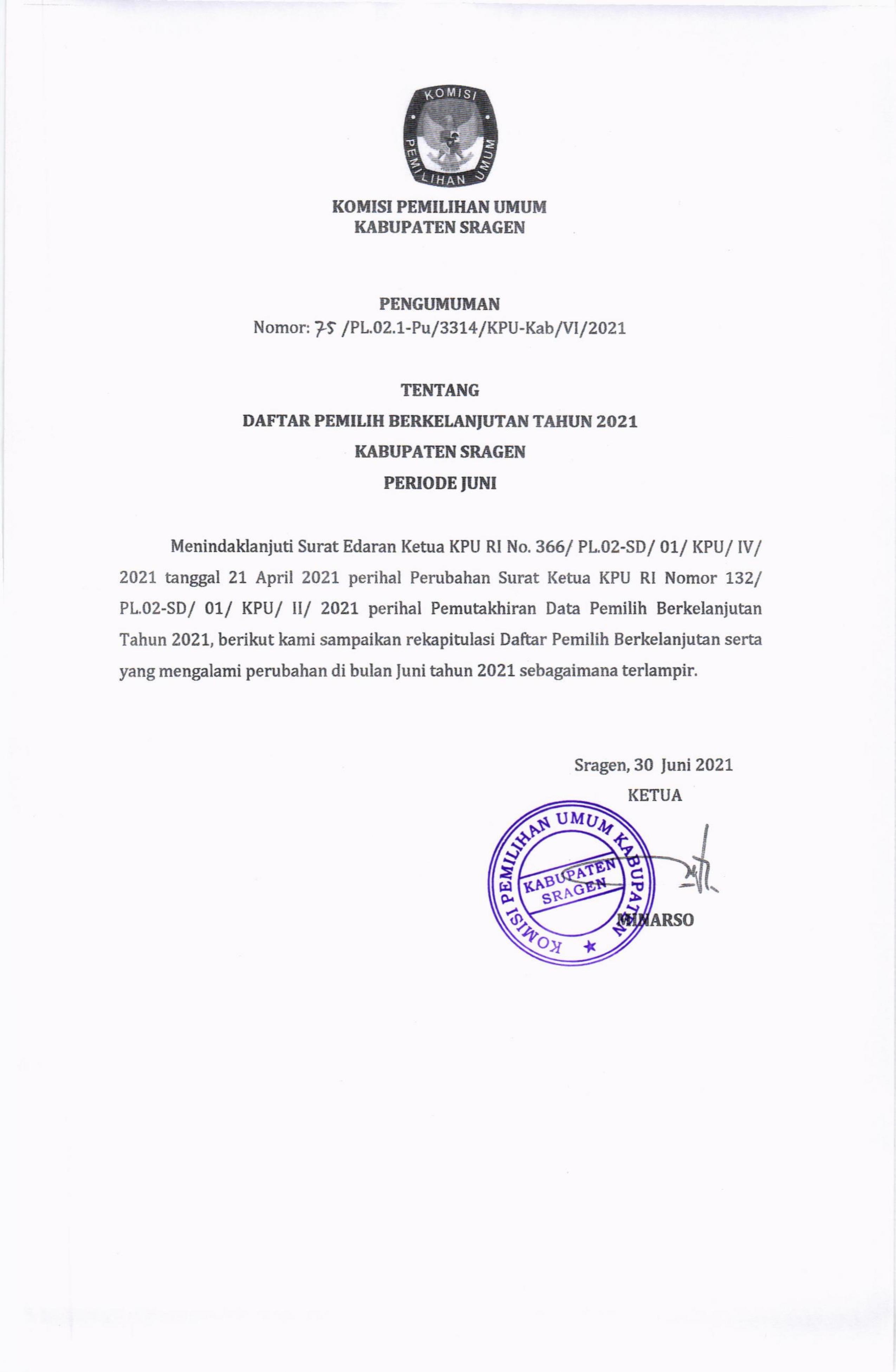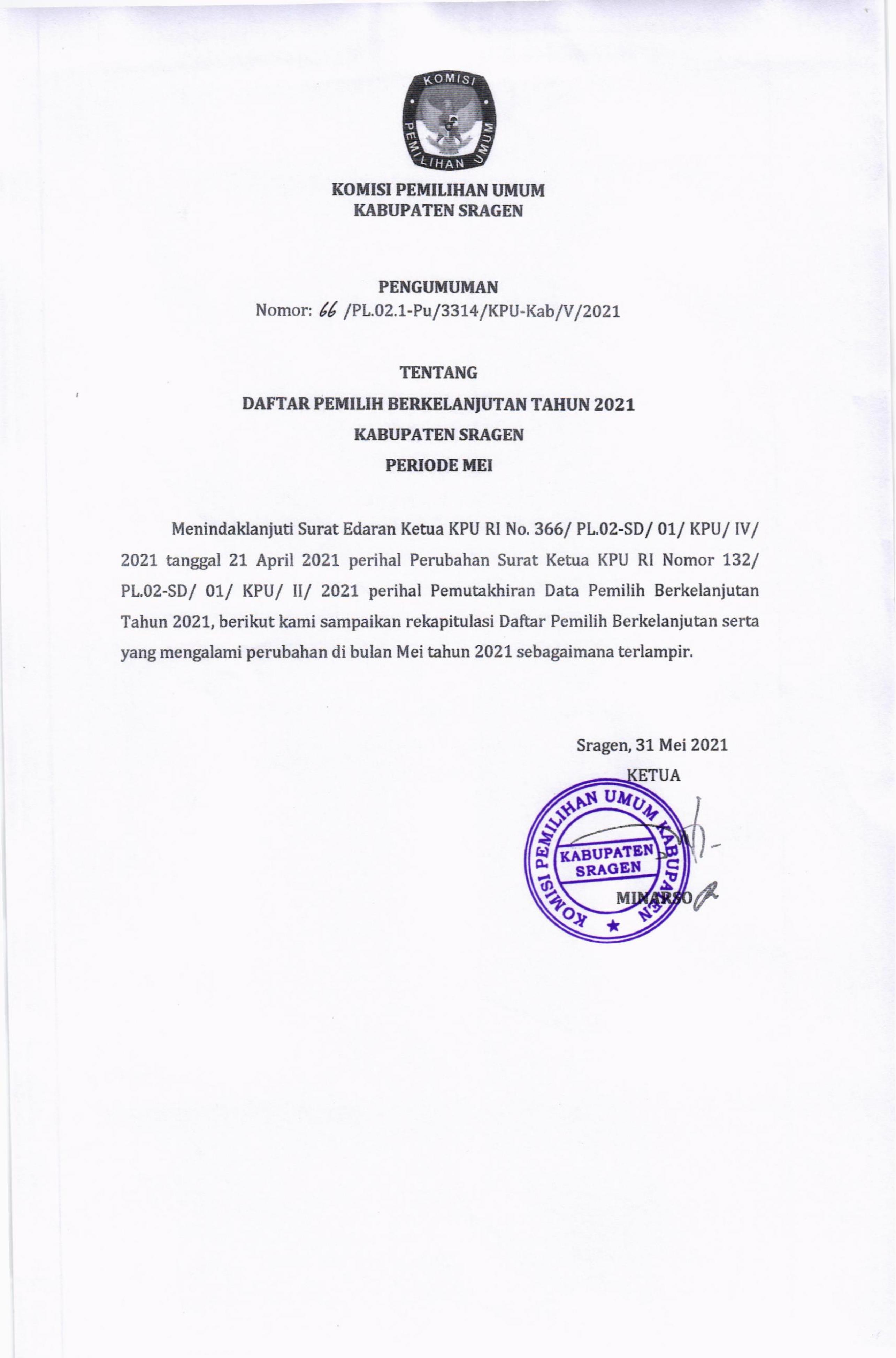 KPU Kabupaten Sragen dengan perantaraan Kantor Pelayanan Kekayaan Negara dan Lelang Surakarta (KPKNL) akan melaksanakan penjualan di muka umum eks logistik Pemilu 2019 berupa surat suara, surat suara pemungutan suara ulang, kotak suara, bilik suara dan sampul suara melalui internet tanpa kehadiran peserta. Untuk informasi selengkapnya ada di tautan Pengumuman Lelang Eks Logistik Pemilu 2019