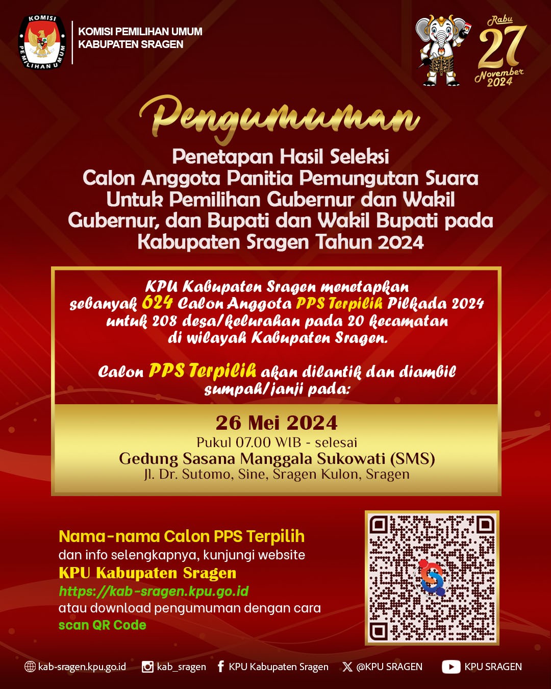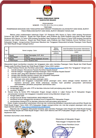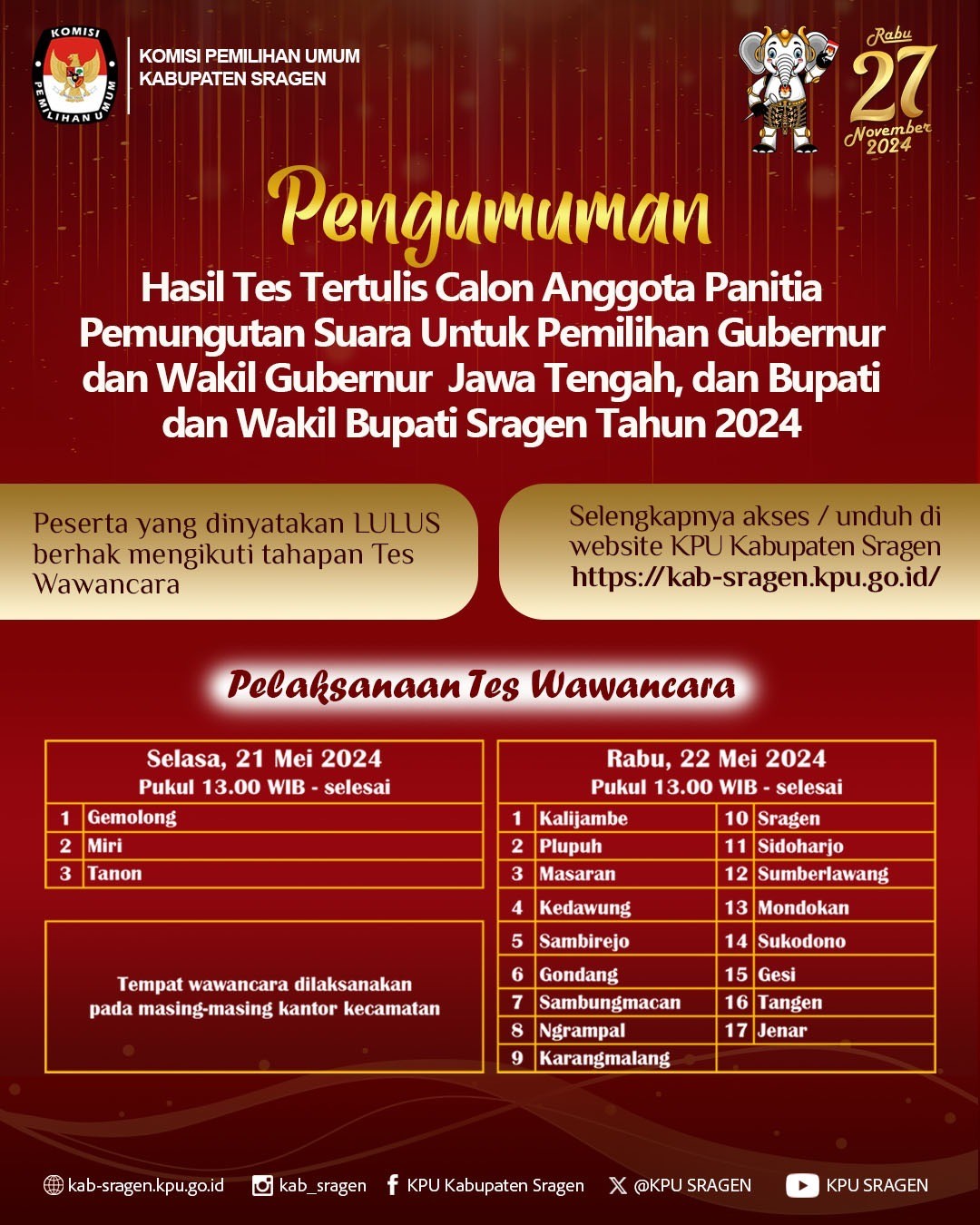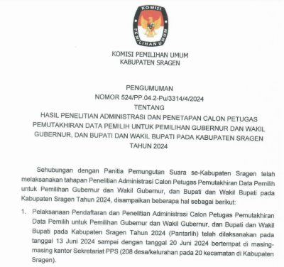 HASIL SELEKSI TERTULIS CALON ANGGOTA PANITIA PEMUNGUTAN SUARA UNTUK PEMILIHAN GUBERNUR DAN WAKIL GUBERNUR, DAN BUPATI DAN WAKIL BUPATI PADA KABUPATEN SRAGEN TAHUN 2024