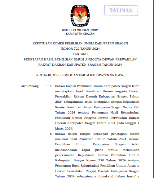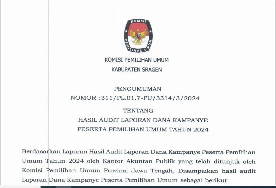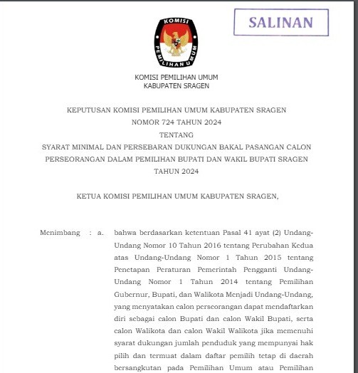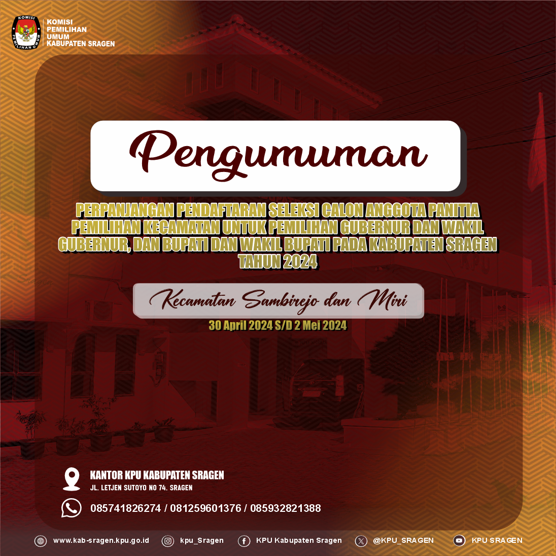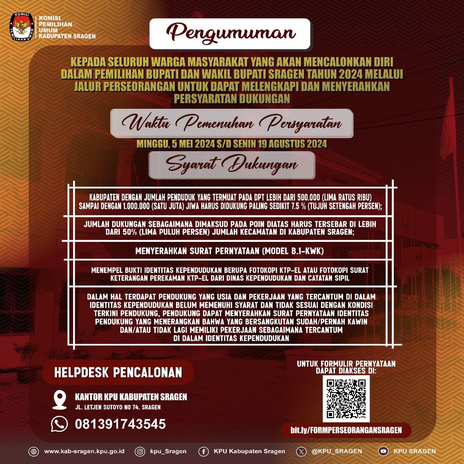 Pengumuman Kepada seluruh warga masyarakat yang akan mencalonkan diri dalam Pemilihan Bupati dan Wakil Bupati Sragen Tahun 2024 melalui jalur perseorangan