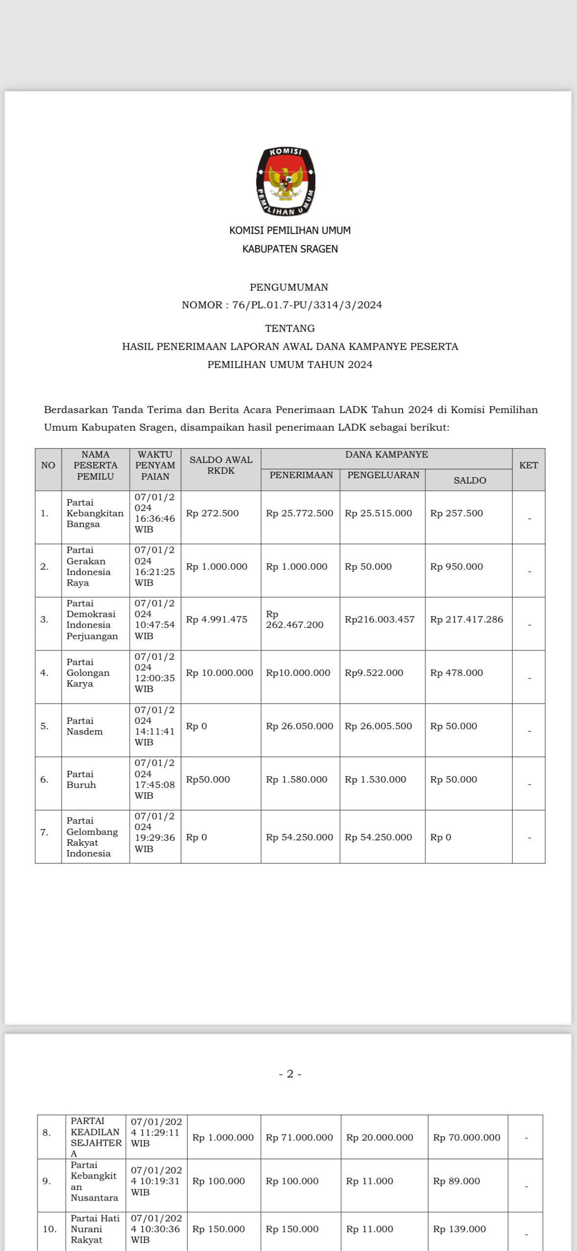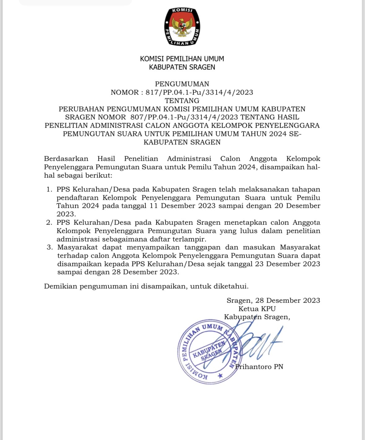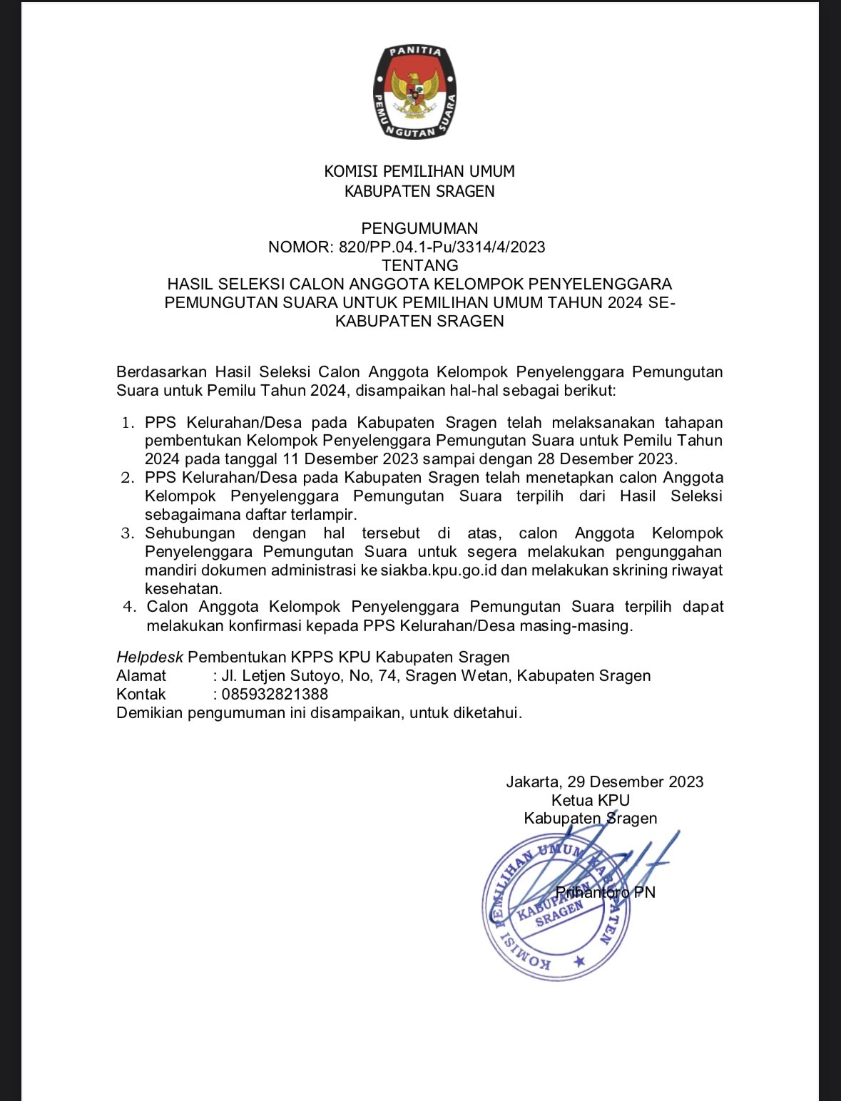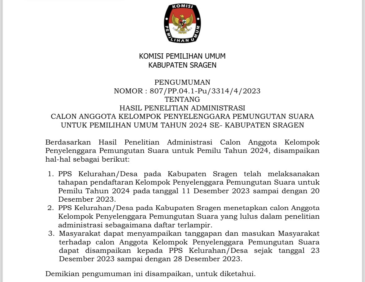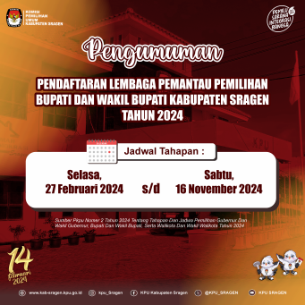 Dalam rangka melaksanakan Keputusan KPU Kabupaten Sragen Nomor : 716 Tahun 2024 tentang Pedoman Teknis Tahapan dan Jadwal Pemilihan Bupati dan Wakil Bupati Sragen Tahun 2024, serta Keputusan KPU Kabupaten Sragen Nomor : 717 Tahun 2024 tentang Pedoman Teknis Pendaftaran dan Akreditasi Pemantau Pemilihan Bupati dan Wakil Bupati Sragen Tahun 2024, maka KPU Kabupaten Sragen mengumumkan pendaftaran Pemantau Pemilihan Bupati dan Wakil Bupati Kabupaten Sragen Tahun 2024 harus memenuhi ketentuan sebagai berikut: