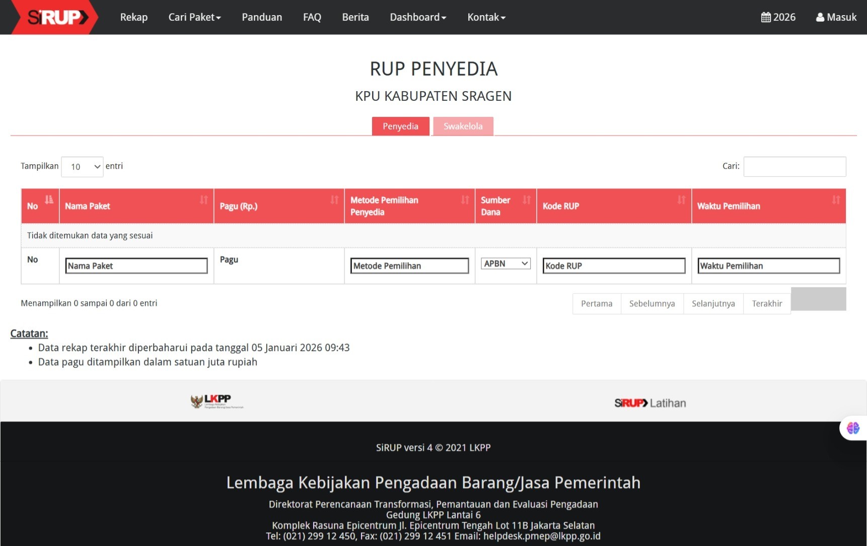 - Klik link SiRUP> untuk mengakses Rencana Umum Pengadaan KPU Kabupaten Sragen Tahun 2026 selengkapnya.