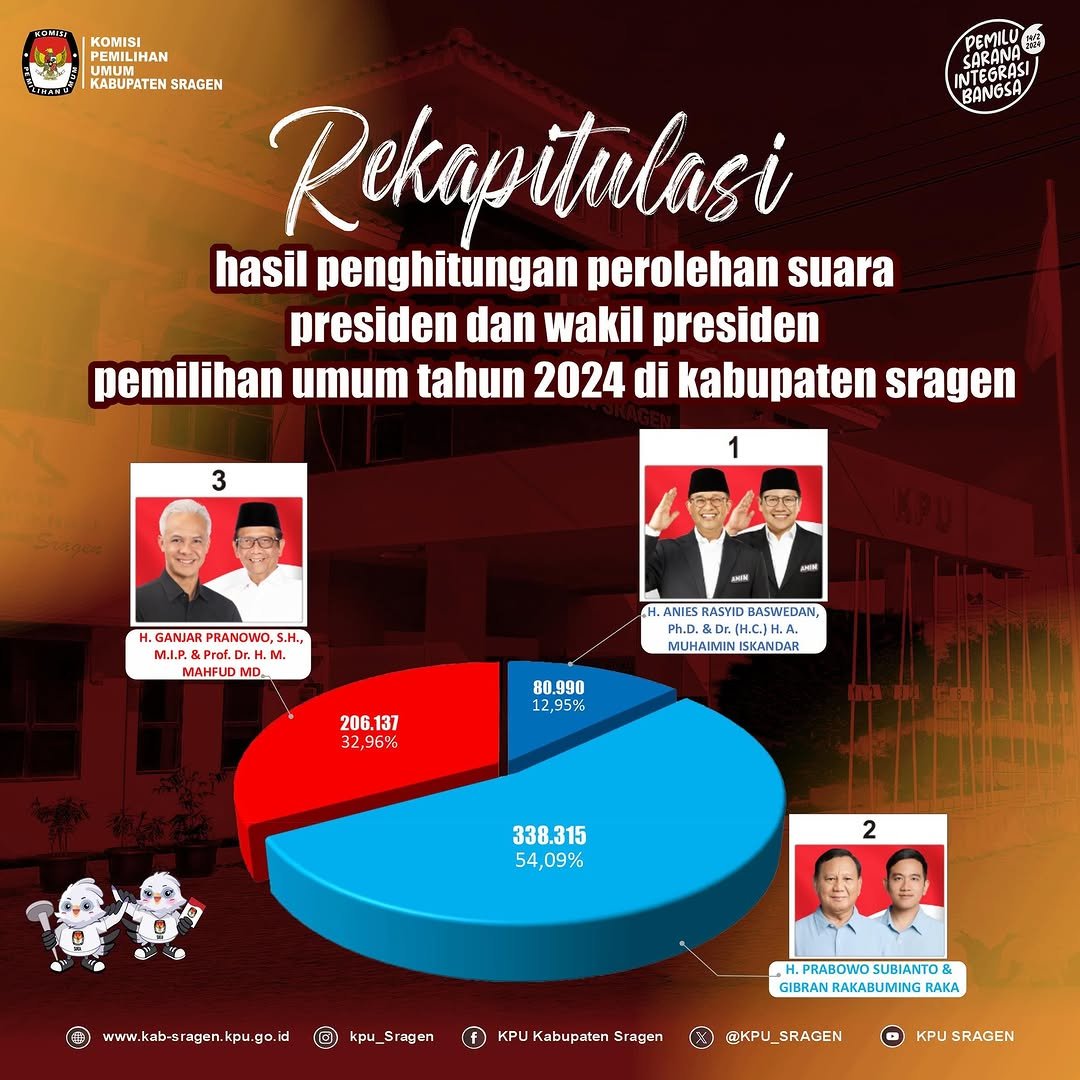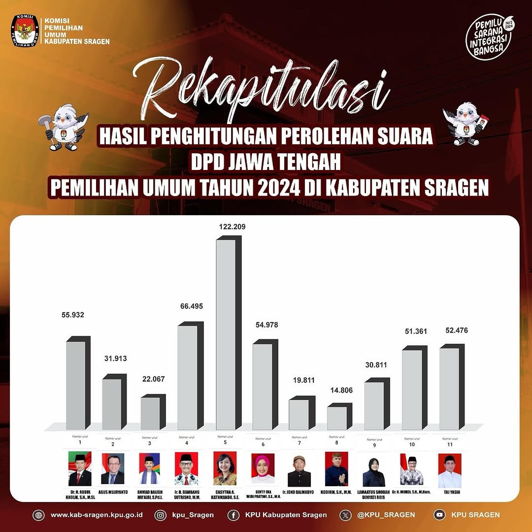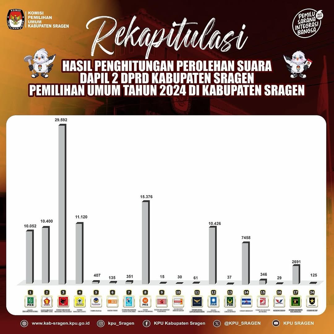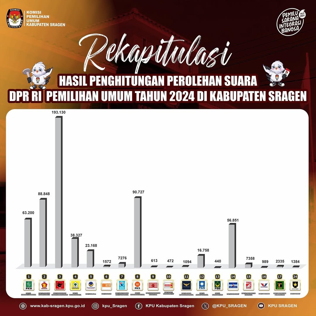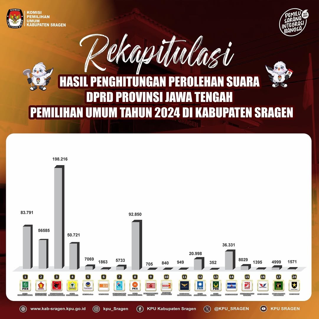 Menampilkan bentuk visualisasi data Pemilu 2024 di wilayah Kabupaten Sragen yang disajikan dengan menggunakan ilustrasi, grafik, dan teks.