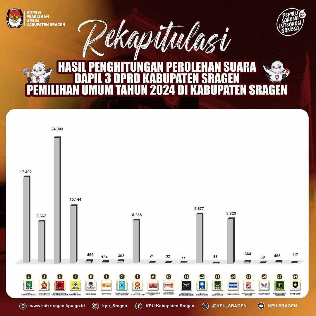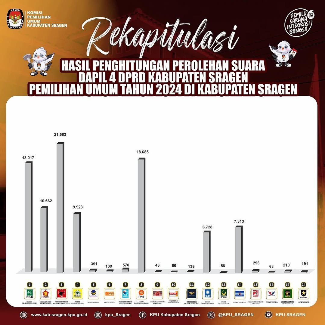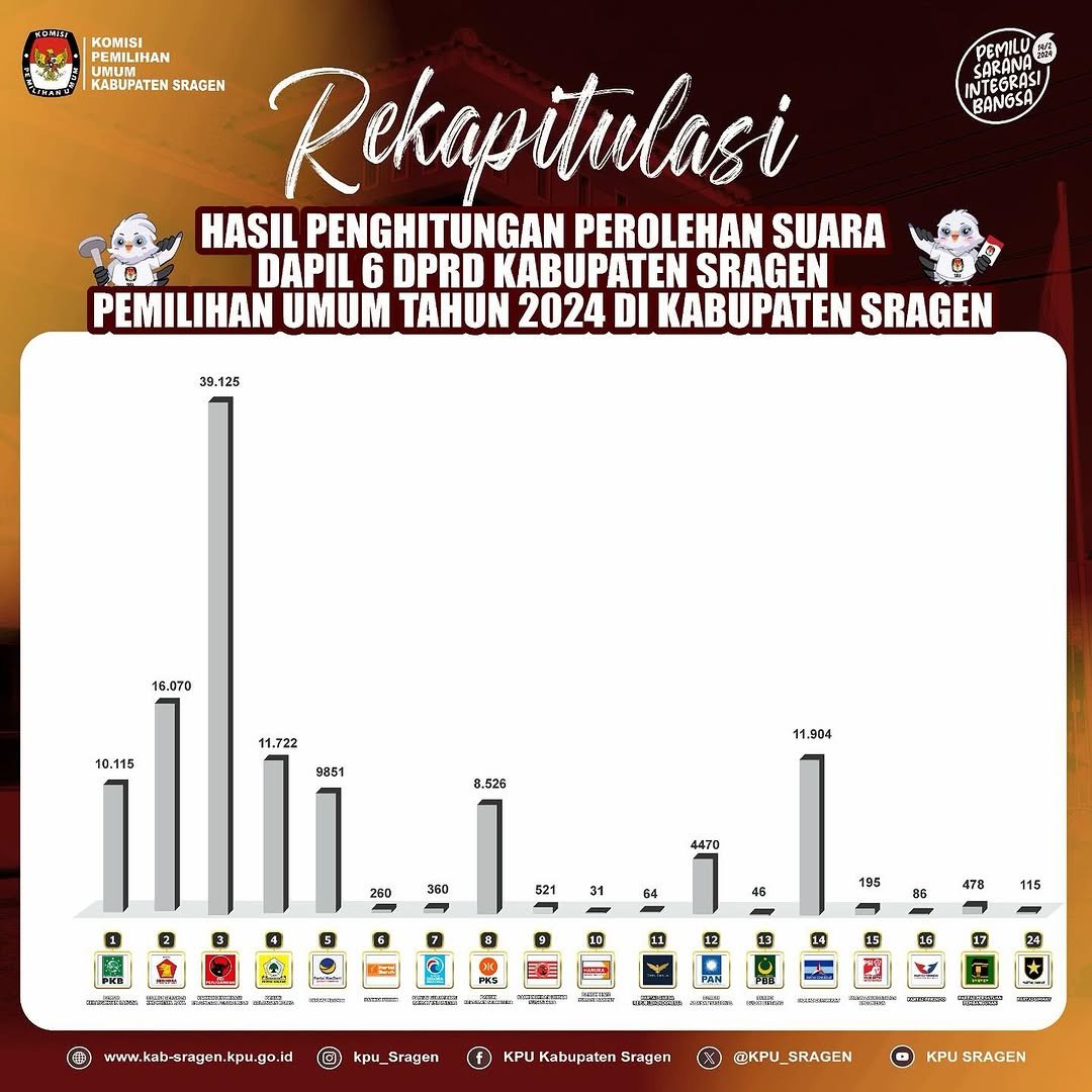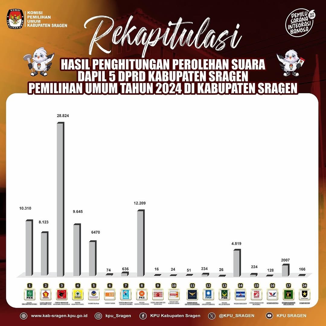 Menampilkan bentuk visualisasi data Pemilu 2024 di wilayah Kabupaten Sragen yang disajikan dengan menggunakan ilustrasi, grafik, dan teks.