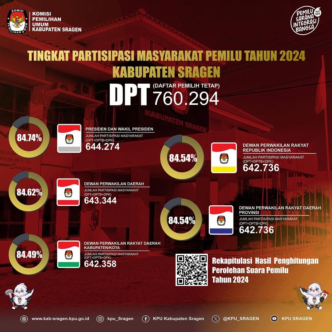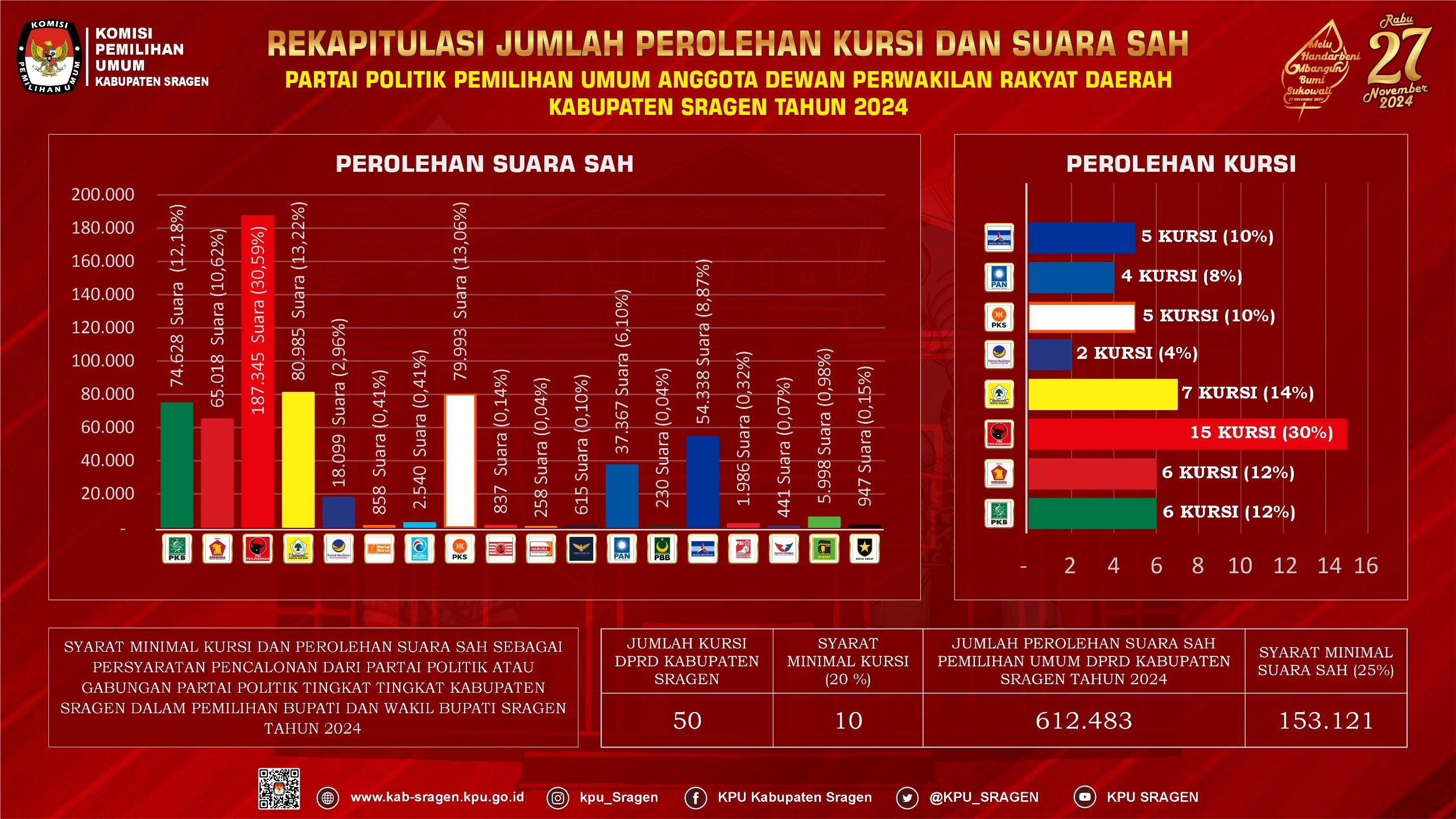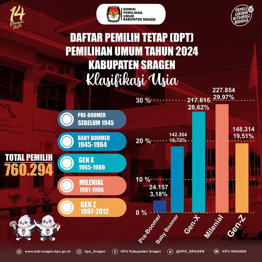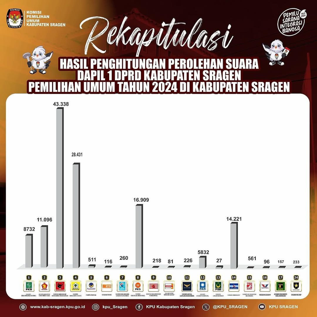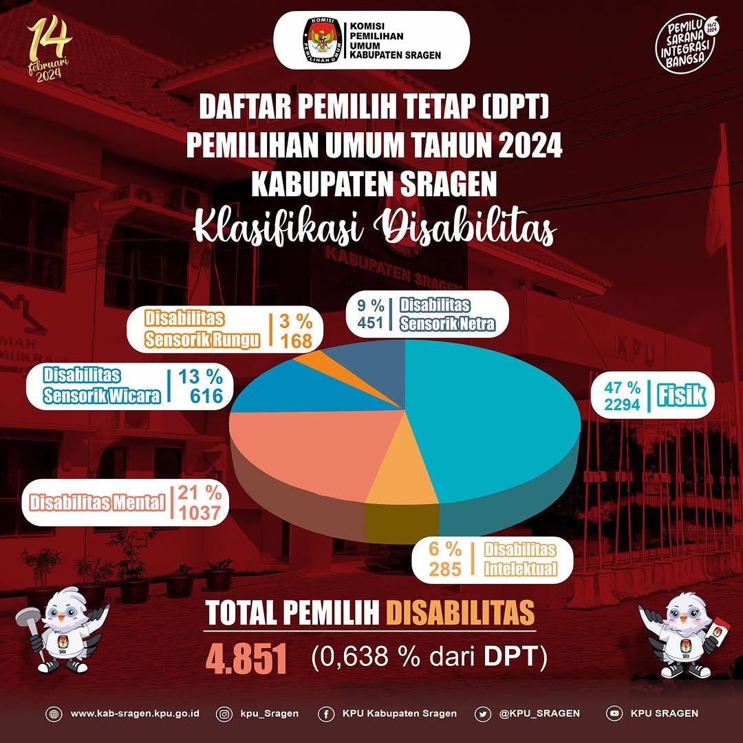 Menampilkan bentuk visualisasi data Pemilu 2024 di wilayah Kabupaten Sragen yang disajikan dengan menggunakan ilustrasi, grafik, dan teks.